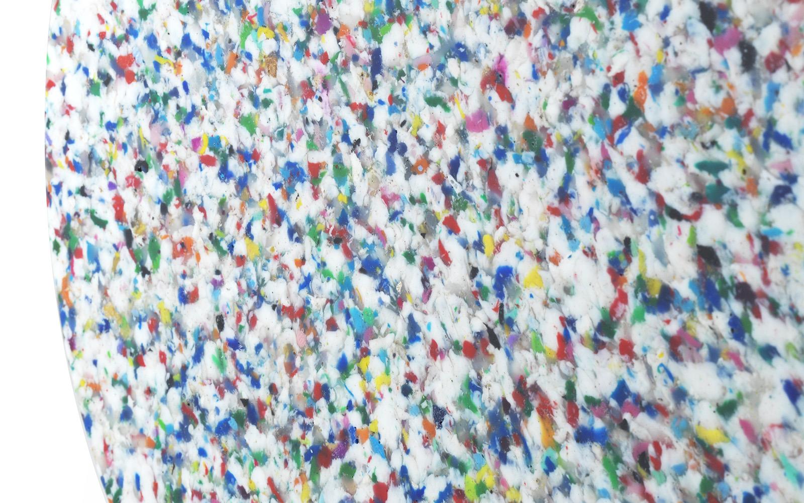 The straightforward, utilitarian look contrasts with the pixelated surface made up of small bits of 100% recycled household and industrial plastic. A particular process, where plastic fragments are heated to a 120°C melting point, makes it possible to repeatedly reuse and reheat the material without altering its properties. The result is a stool design with a distinctive thickness and composition, making every Bit a bit unique.