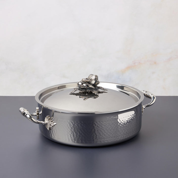 Made with best-in-class clad stainless steel: a thick core of super conductive aluminum alloy guarantees great responsiveness, ensuring food will not burn or overcook. The inside is lined in brushed stainless steel, practical and easy to clean, whilst the external stainless steel layer is induction-ready and hammered by our master artisans to ensure lasting beauty. The stainless steel handles are decorated with delicate leaves and the lid is enriched with finials in the shape of garden vegetables, hand cast in solid bronze and silver plated.
