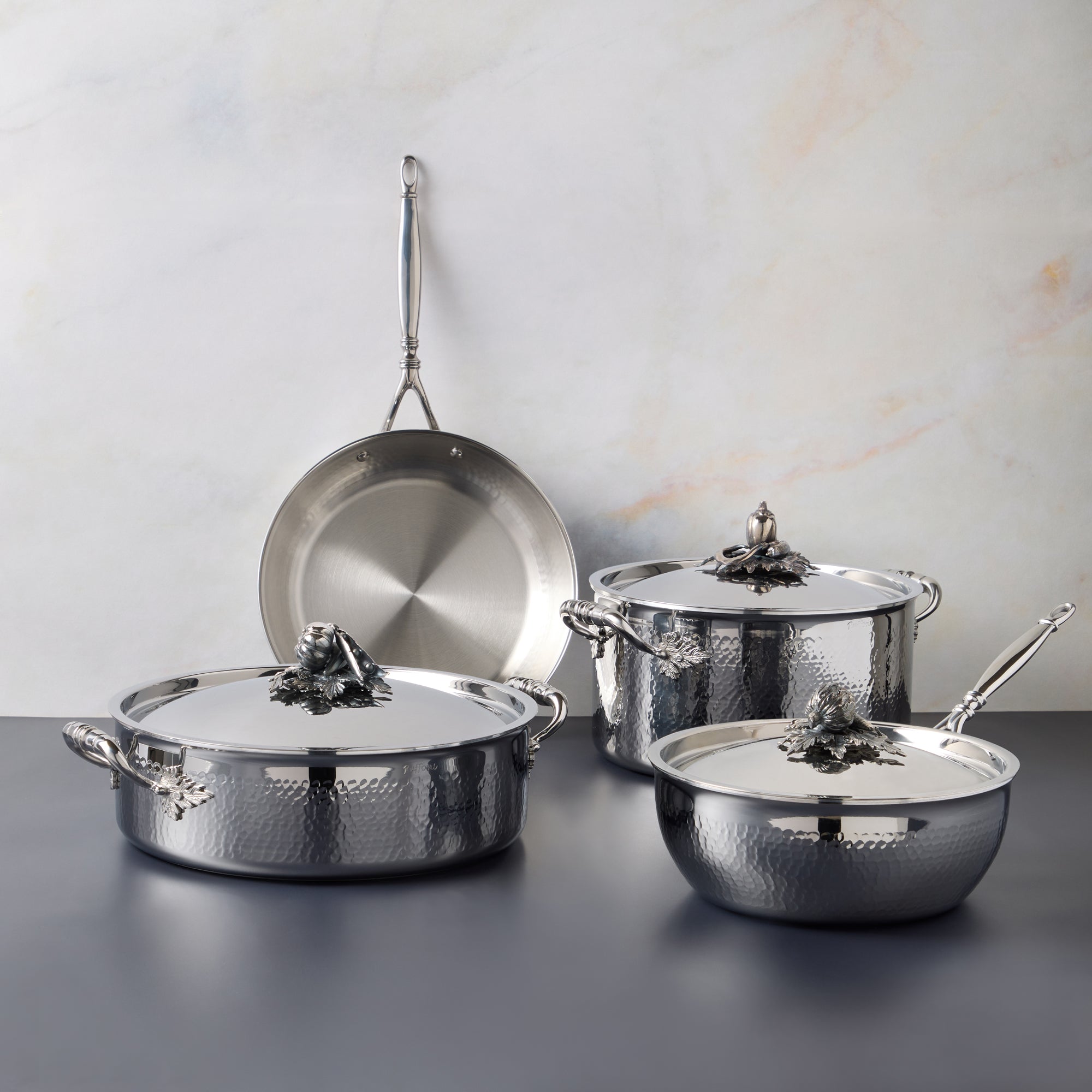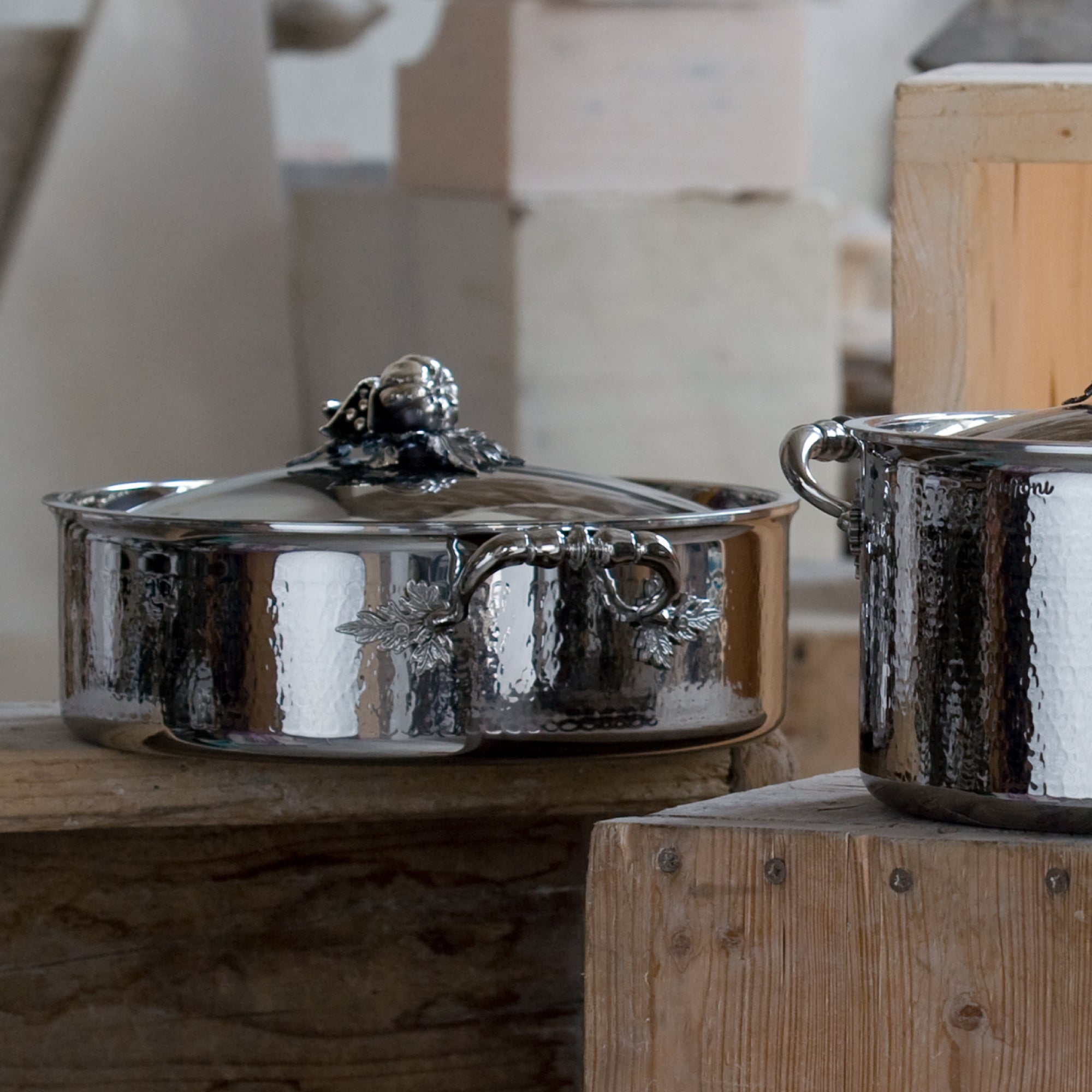 All the pieces are made with best-in-class clad stainless steel: a thick core of superconductive aluminum alloy guarantees great responsiveness, ensuring food will not burn or overcook. The inside is lined in stainless steel, practical and easy to clean, while the external stainless steel layer is induction-ready and hammered by our master artisans to ensure lasting beauty. The stainless steel handles are decorated with delicate leaves, and the lids are crowned by silver-plated, decorated knobs.