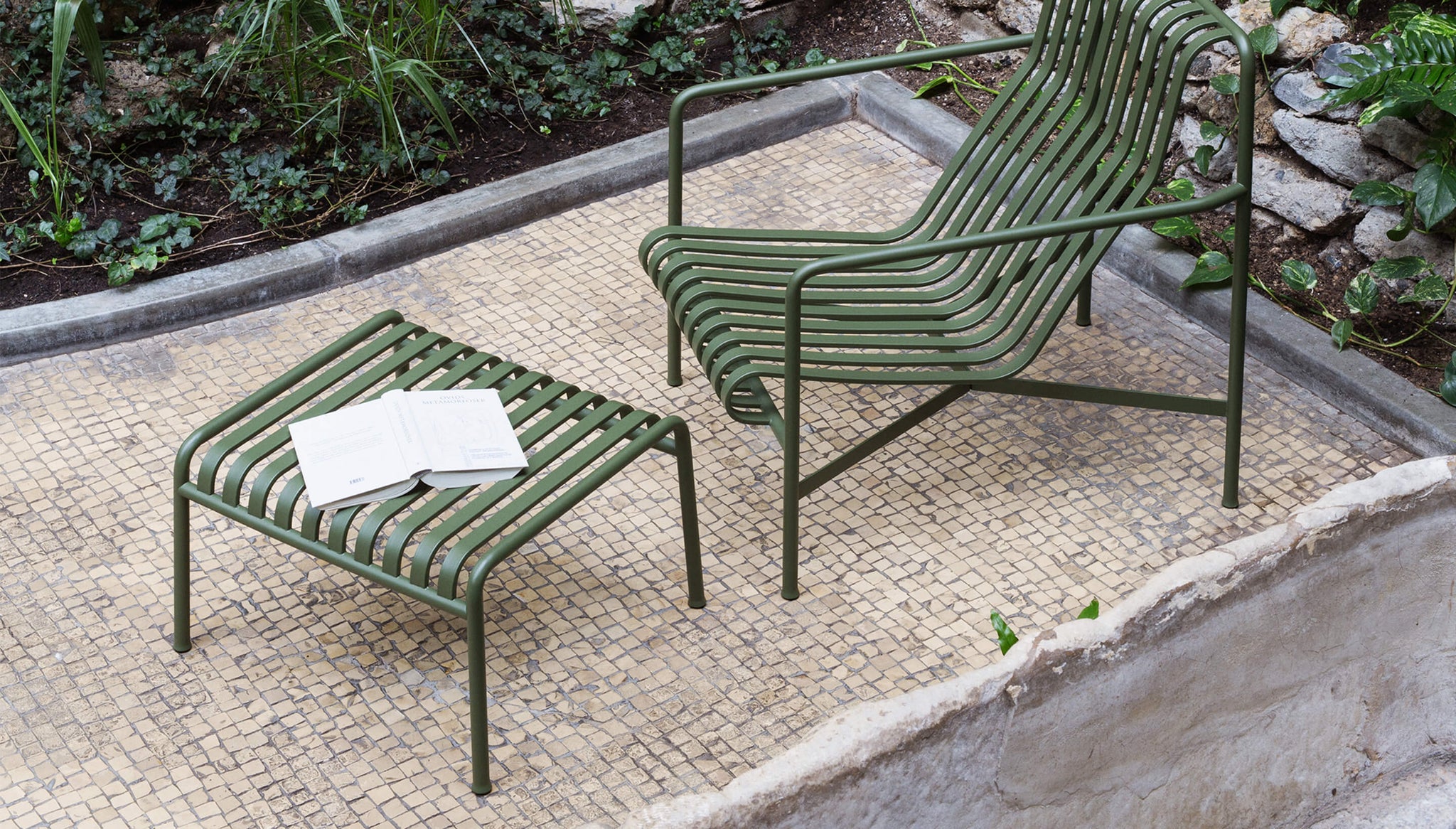 Palissade is a collection of outdoor furniture designed by Ronan and Erwan Bouroullec for HAY. The collection was designed to fit a wide variety of environments: cafés, restaurants, gardens, terraces and balconies. The construction allows a wide range of typologies with a common formal language. From stools and benches to chairs and tables, lounge chairs and sofas – the collection comprises 13 different elements, united not only by their graphical image but also by their common characteristics: they are strong without being bulky, elegant without being fragile.
