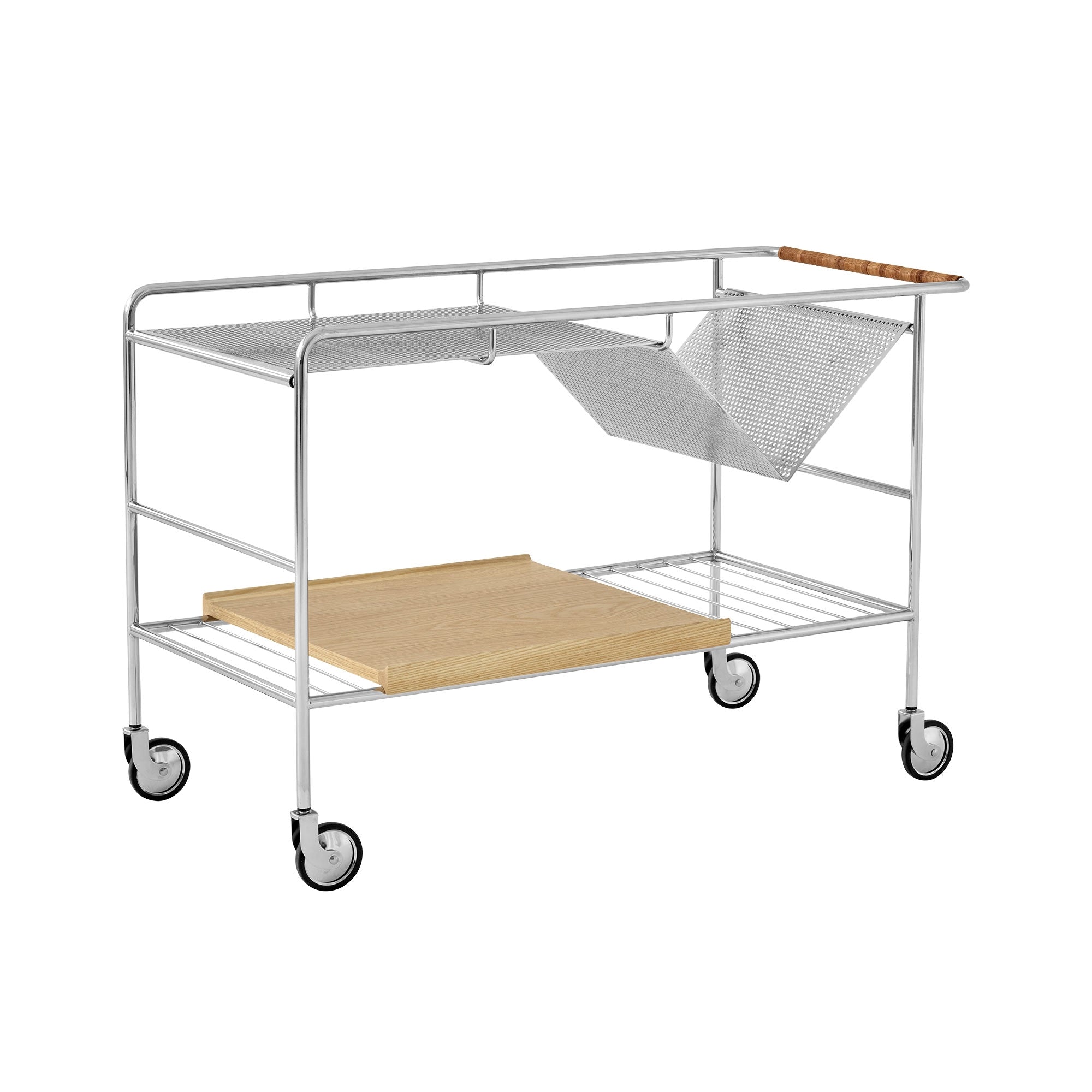 The trolley is made of bent and welded tubes, and the leather cord is carefully webbed around the handle. The wooden tray is made of a veneer plate and milled edges in solid wood