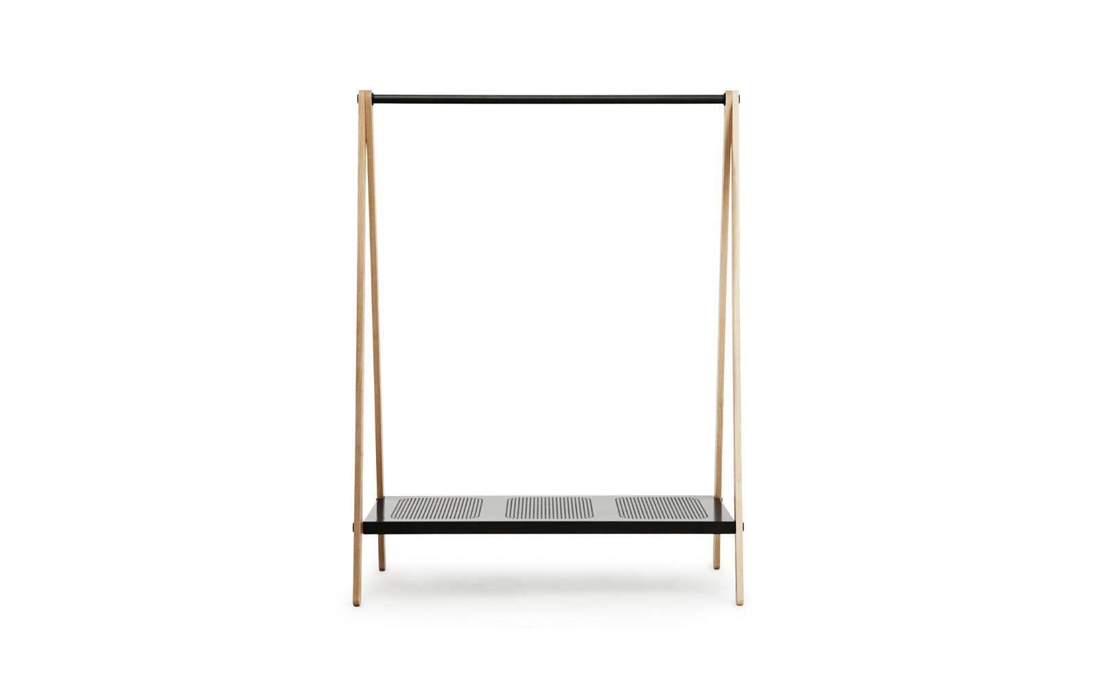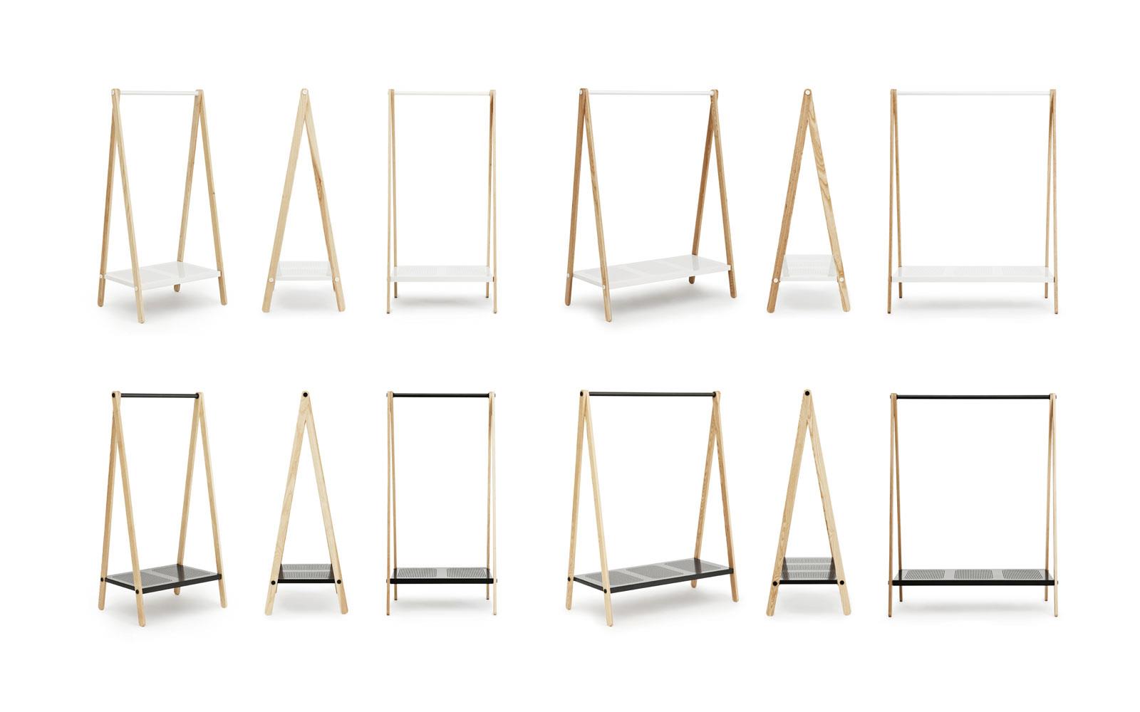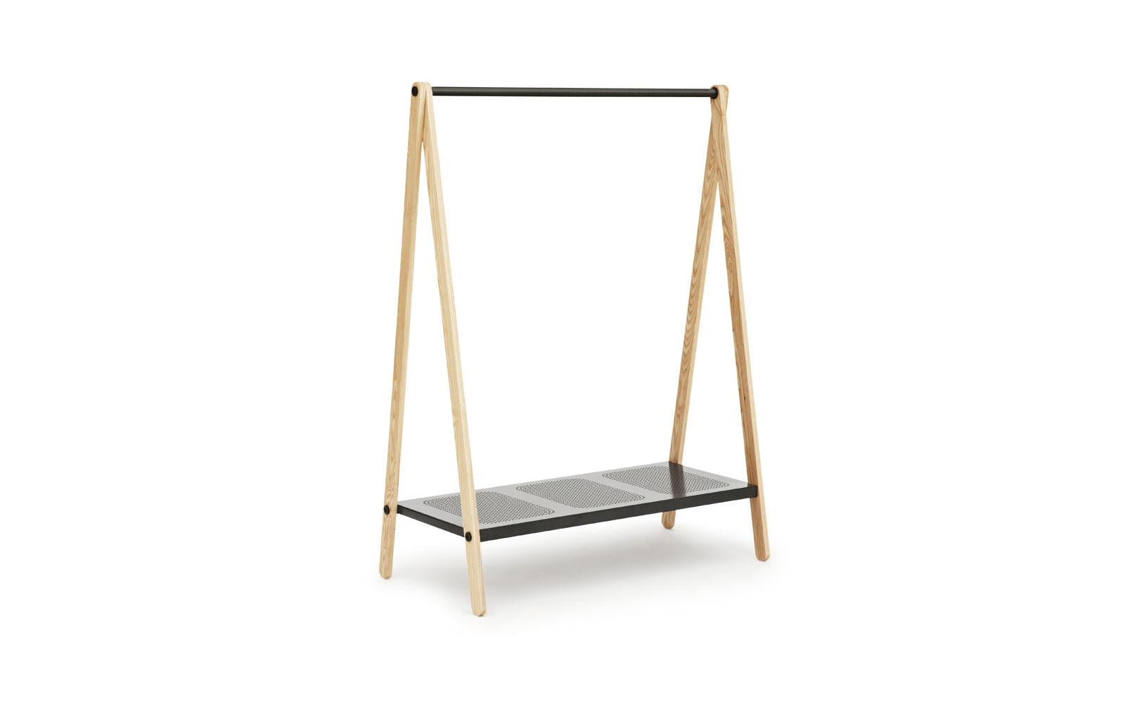 Toj is a clothes rack with an industrial and simple expression. Its function is evident and its simple construction - with a rail, shelf and trusses - provides space for clothes, shoes and bags.
